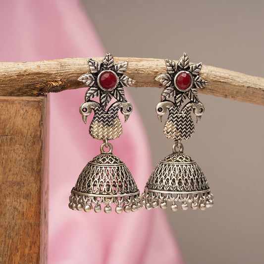 Pretty Peacock stone studded jhumka earring (Red)