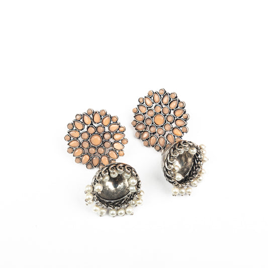Floral carves stone studded jhumki earrings (Light Orange)