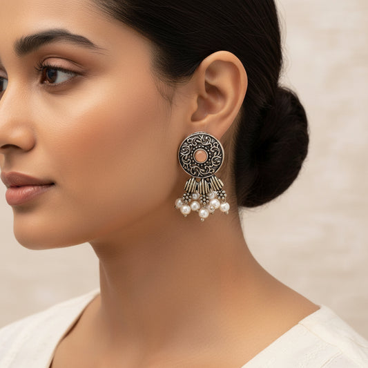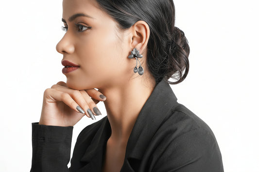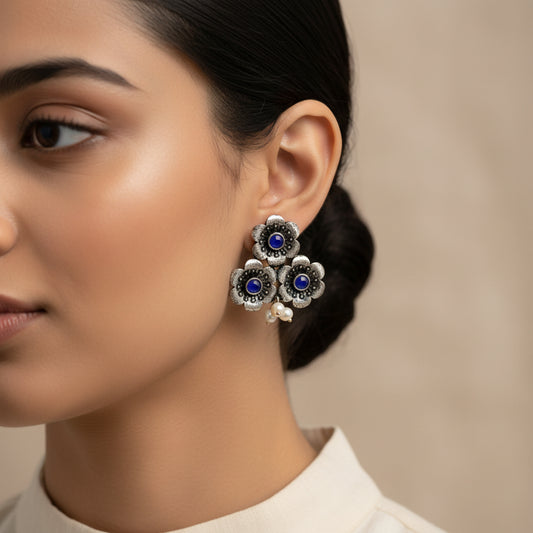 Blue Stone Studded Statement German Silver Dangler Earrings