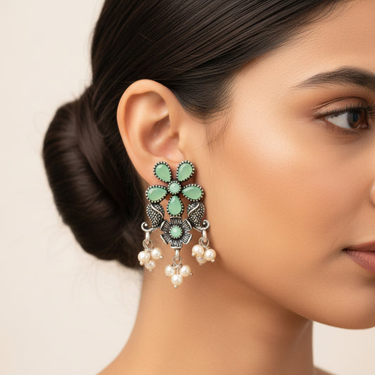 Flower motif hanging pearls dangler earring (Green)