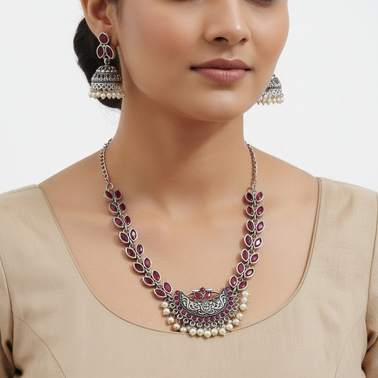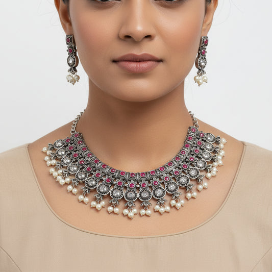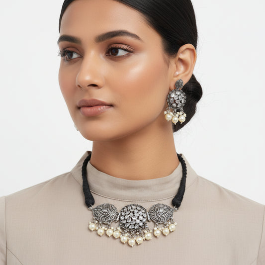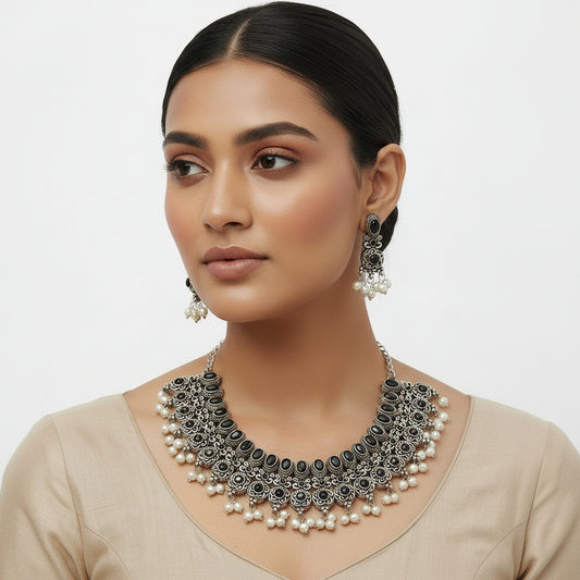 Regal silver pearl oxidised chain neckpiece (Silver)
