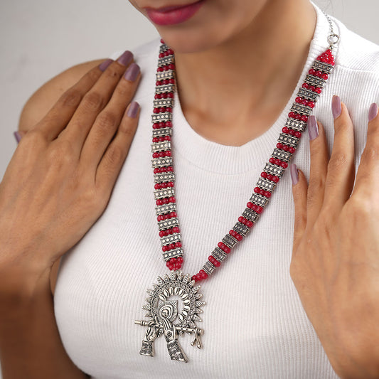 Krishna aura statement pendant beaded neckpiece (Red)