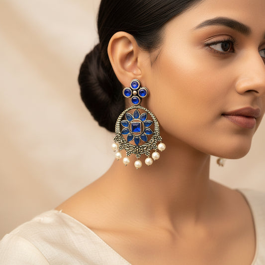 Flower Rangoli Pearl dangler earrings (Blue)