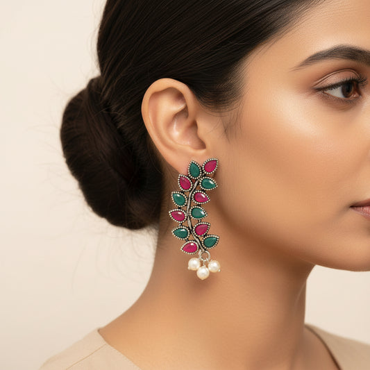 Regal leaffall stone studded jhumki earrings (Multicolored)