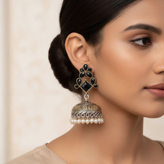 Tusks and twinkle stone studded jhumka earrings (Black)