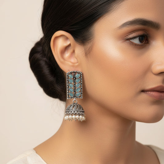 Regal leaffall stone studded jhumki earrings (Mint)