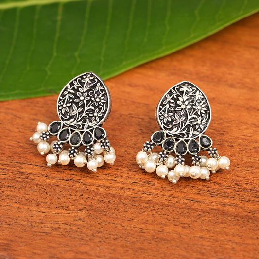 Flower motif hanging pearls dangler earring (Black)