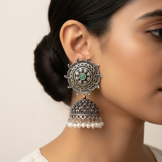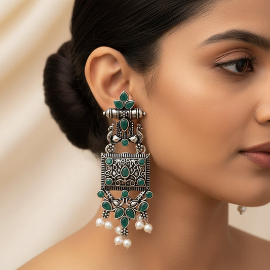 Peaflair pearls oxidised dangler earrings (Green)