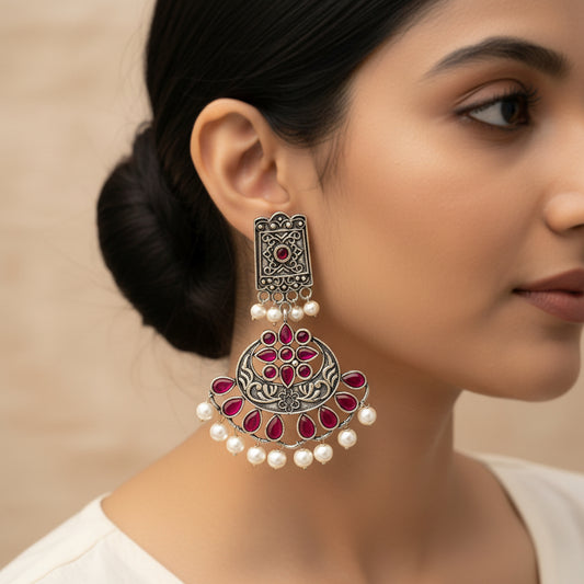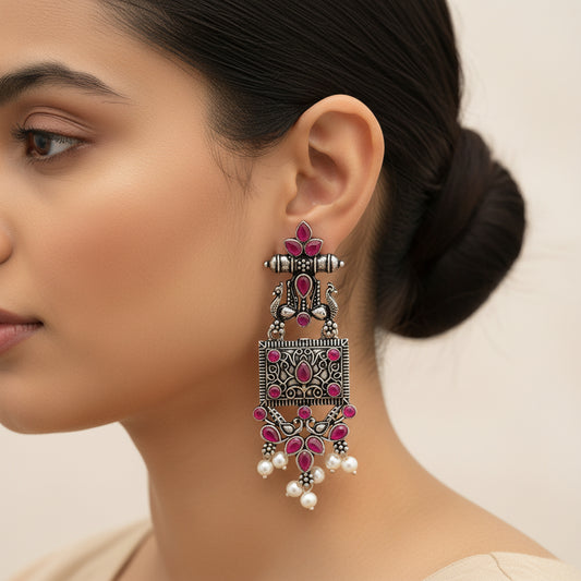 Peaflair pearls oxidised dangler earrings (Red)