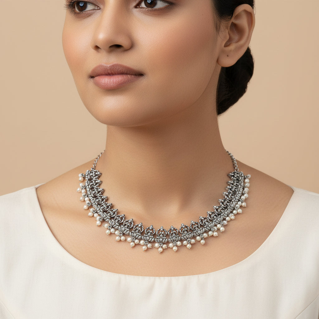 Regal silver pearl oxidised chain neckpiece (Silver)