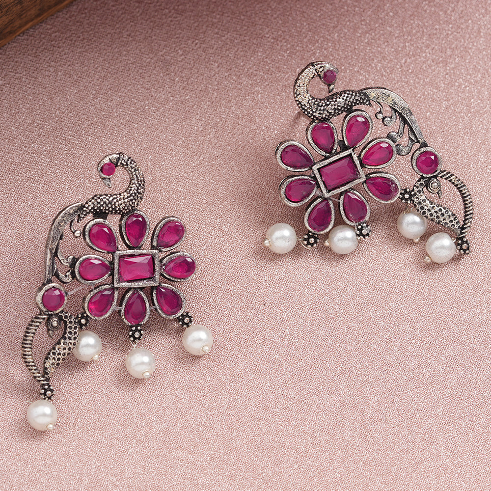 Peacock flower pearl stud earrings (Red)